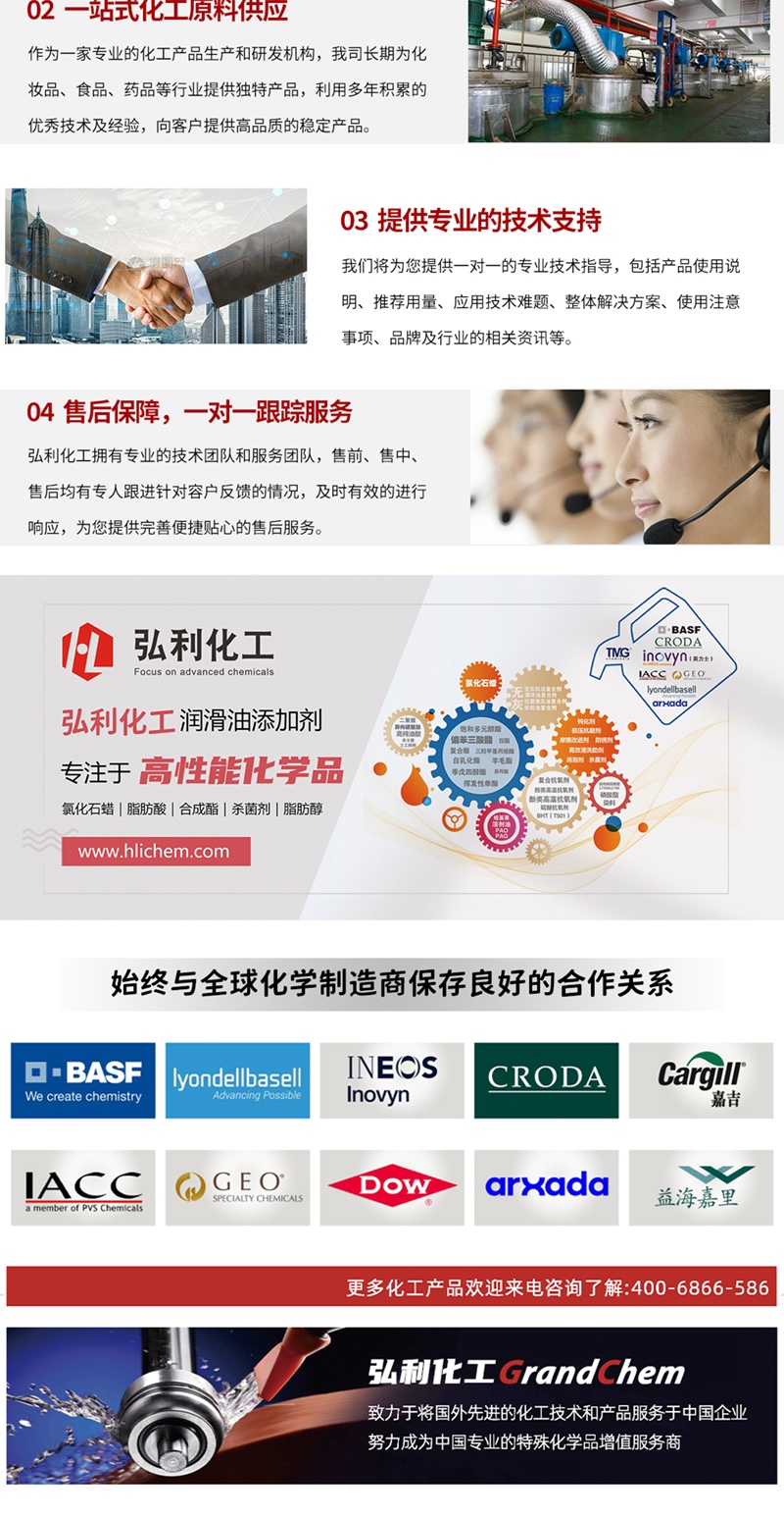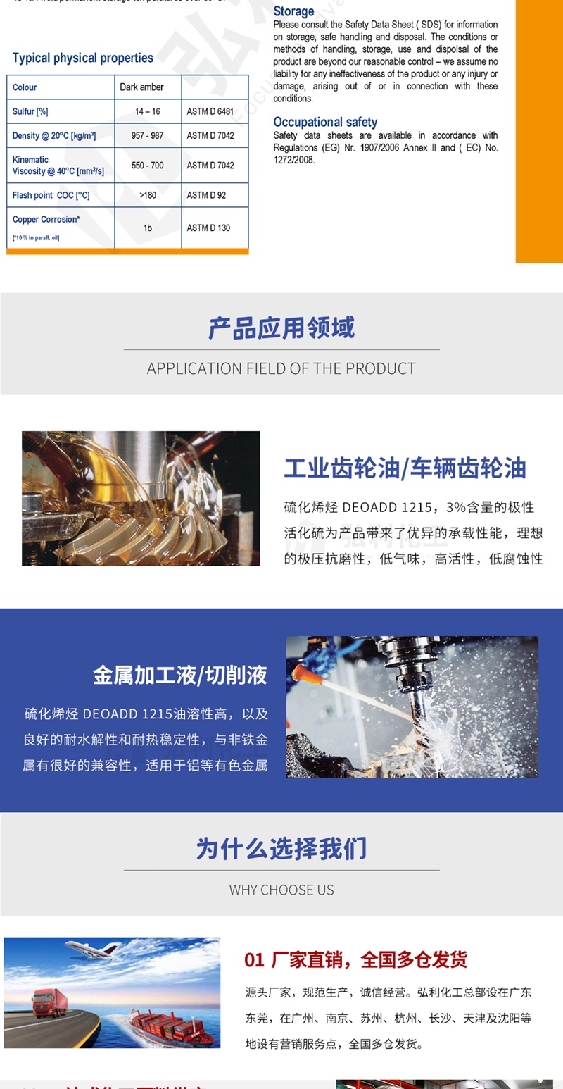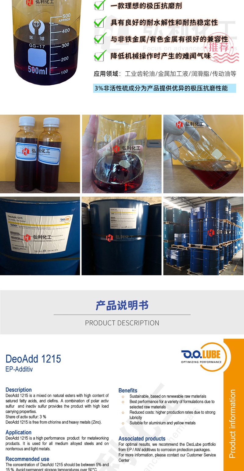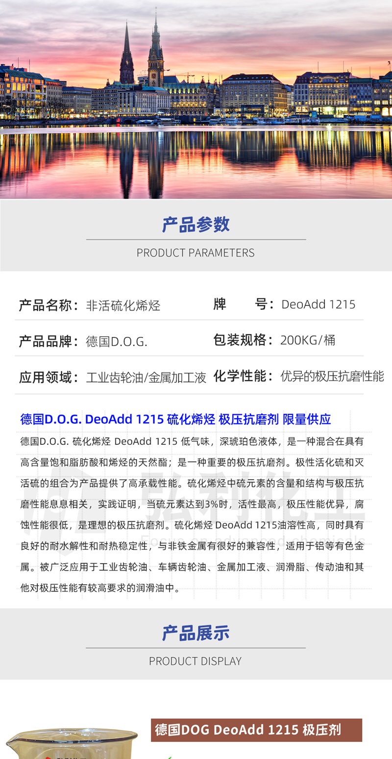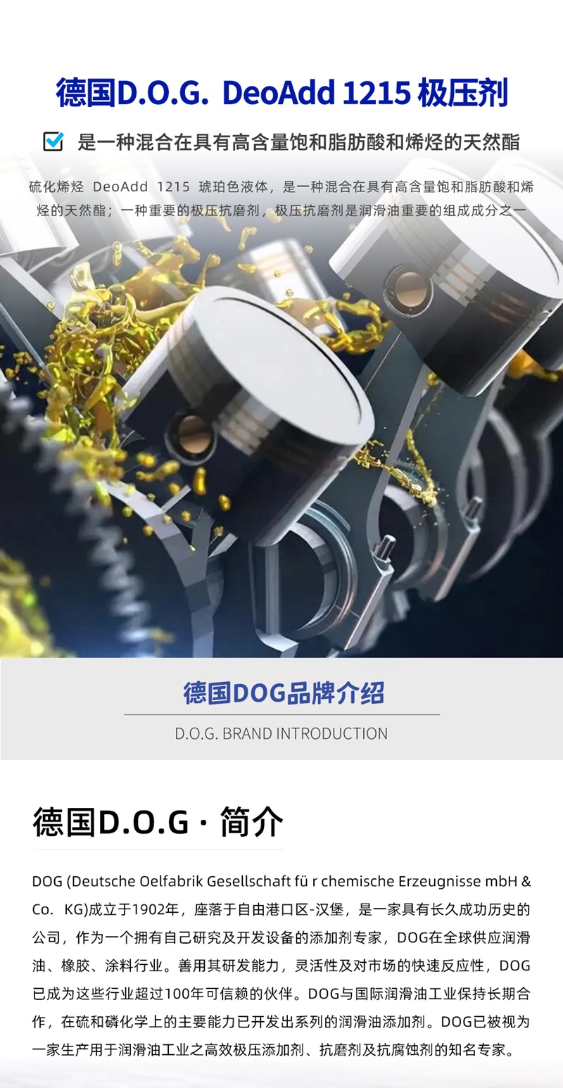 产品简介:德国D.O.G. 硫化烯烃 DeoAdd 1215 低气味,深琥珀色液体,是一种混合在具有高含量饱和脂肪酸和烯烃的天然酯。是一种重要的极压抗磨剂,极压抗磨剂是bg真人平台重要的组成成分之一。极性活化硫和灭活硫的组合为产品提供了高承载性能,活化硫成分比例为3%。硫化烯烃中硫元素的含量和结构与极压抗磨性能息息相关,实践证明,当硫元素达到3%时,活性最高,极压性能优异,腐蚀性能很低,是理想的极压抗磨剂。硫化烯烃 DeoAdd 1215油溶性高,同时具有良好的耐水解性和耐热稳定性,与金属有很好的兼容性,适用于铝等有色金属。被广泛应用于工业齿轮油、车辆齿轮油、金属加工液、润滑脂、传动油和其他对极压性能有较高要求的bg真人平台中。德国D.O.G. 硫化烯烃 DeoAdd 1215 是一款理想的极压抗磨剂。