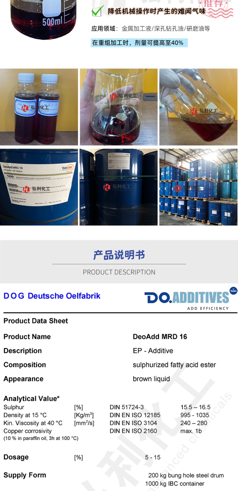 产品简介:德国D.O.G. 极压剂 DeoAdd MRD 16 硫化三酸甘油酯,浅棕色清澈液体。它是一种棕色、低气味的EP–金属加工液添加剂。硫含量适中,润滑性优良,符合bg真人平台环保认证以及欧洲生态标准规范。可生物降解,被归类在LuSC列表(润滑物质分类列表)中。DeoAdd MRD 16 与非铁金属拥有很好的兼容性。为了提高性能,建议与脂肪油和二烷基二硫代磷酸锌组合,成型配方中的添加量可高达40%。添加于高压中使用的加工油,避免高压对器具造成损害。添加剂化学结构之优势及会与金属表面产生键结的特性,可避免工具与器材之间的直接接触,而减少因摩擦所造成的损害。降低动态接点的摩擦,允许其承受更高压力。浅色、低气味,在金属工业领域中,可降低机械操作时所产生的难闻气味。使用于各种的工业bg真人平台及金属切割油(例如深度钻孔和研磨用油)。