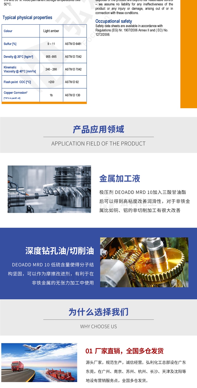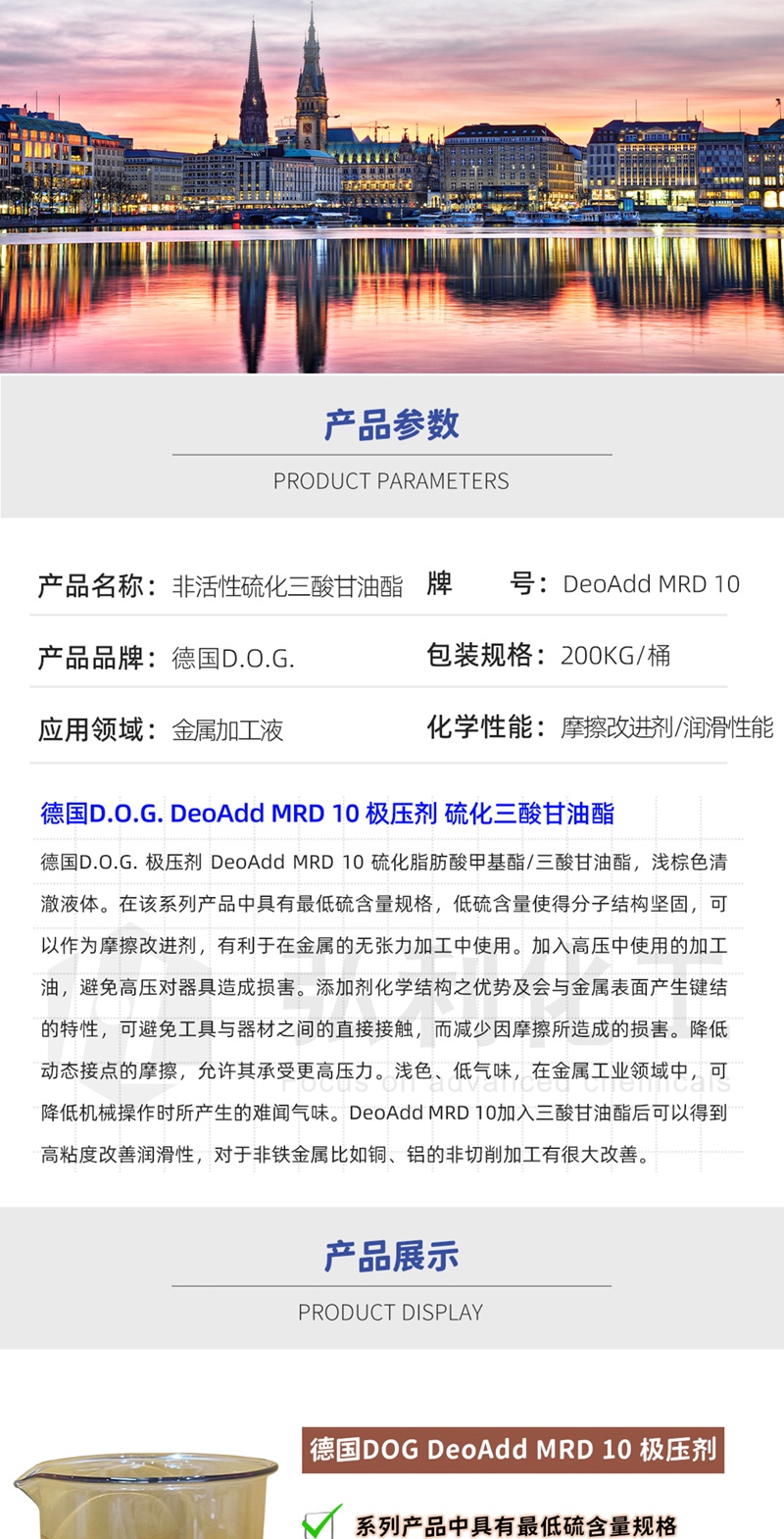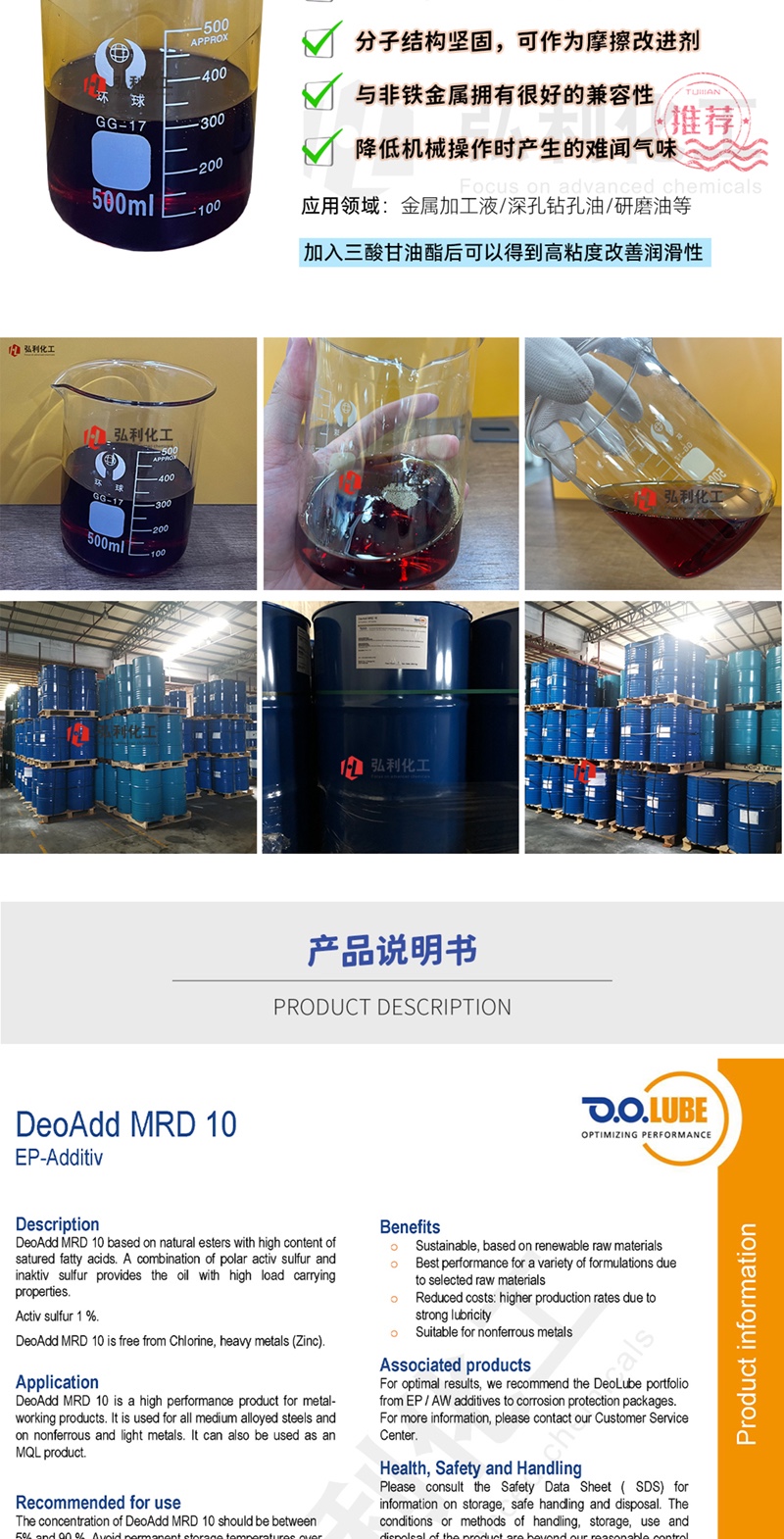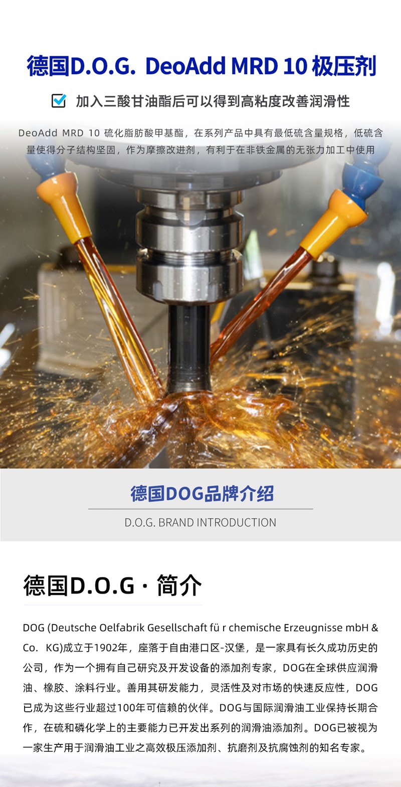 产品简介:德国D.O.G. 极压剂 DeoAdd MRD 10 硫化脂肪酸甲基酯/三酸甘油酯,浅棕色清澈液体。在该系列产品中具有最低硫含量规格,低硫含量使得分子结构坚固,可以作为摩擦改进剂,有利于在非铁金属的无张力加工中使用。加于高压中使用的加工油,避免高压对器具造成损害。添加剂化学结构之优势及会与金属表面产生键结的特性,可避免工具与器材之间的直接接触,而减少因摩擦所造成的损害。降低动态接点的摩擦,允许其承受更高压力。浅色、低气味,在金属工业领域中,可降低机械操作时所产生的难闻气味。DeoAdd MRD 10加入三酸甘油酯后可以得到高粘度改善润滑性,对于非铁金属比如铜、铝的非切削加工有很大改善。