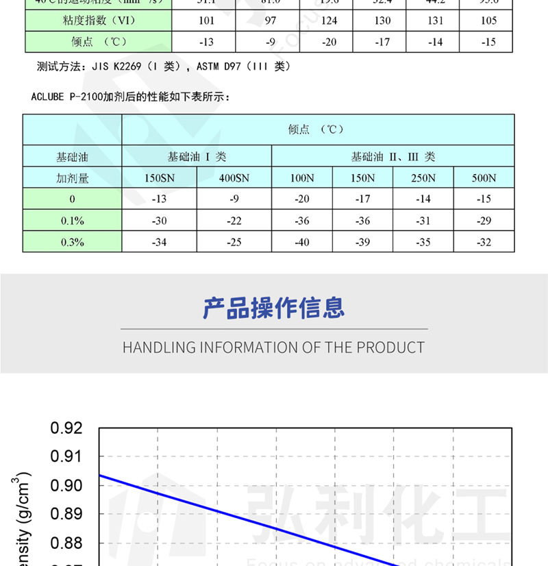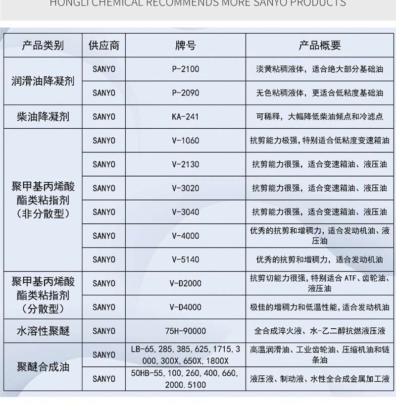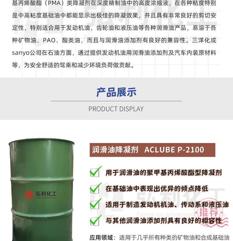 产品简介:三洋sanyo ACLUBE P-2100 是用于bg真人平台的聚甲基丙烯酸酯(PMA)型降凝剂,是一种矿物油(高度精炼油)中的浓缩甲基丙烯酸烷基酯共聚物。在中等至高粘度的基础油上表现出优异的倾点降低,同时,具有优异的剪切稳定性。适用于制造发动机机油、传动系和液压油。易溶于几乎所有种类的矿物油和合成基础油,与其他常规bg真人平台添加剂具有良好的相容性。