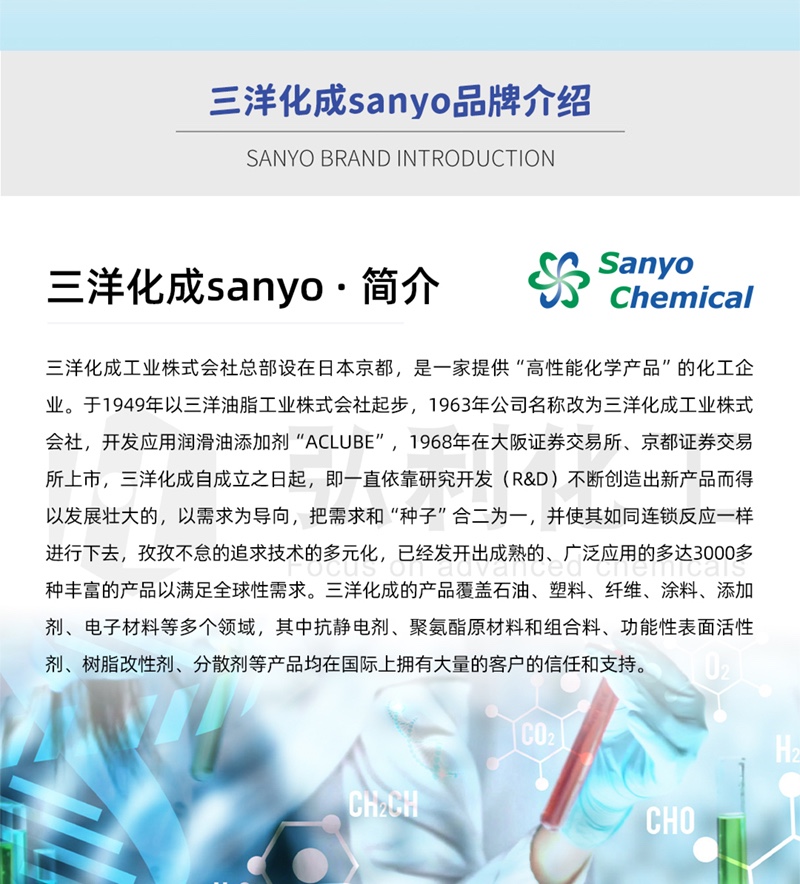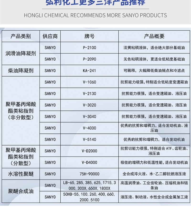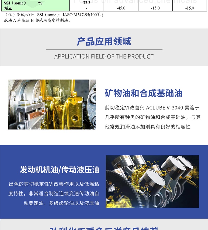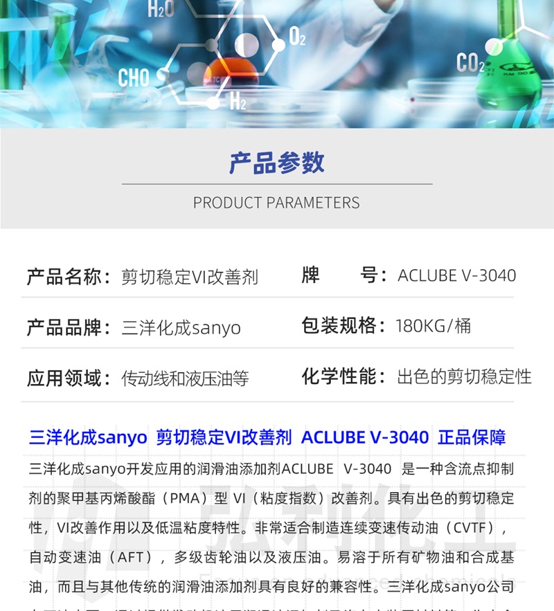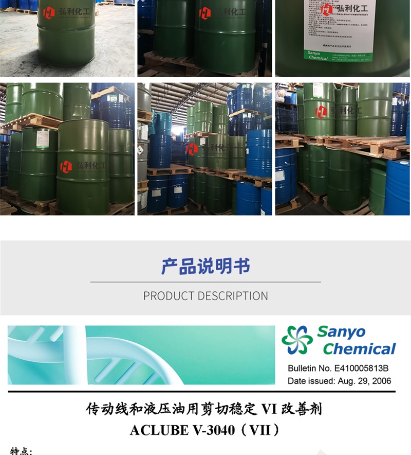 bg真人平台 化工为你详细介绍三洋化成Sanyo 传动线和液压油用剪切稳定VI改善剂 ACLUBE V-3040(VII)的产品详情,包括三洋化成Sanyo品牌下的所有产品的用途、型号、范围、图片、新闻及价格。同时bg真人平台 还为您精选了相关的行业资讯、价格行情、展会信息、图片资料等,在全国地区获得用户好评,欲了解更多详细信息,请点击访问。