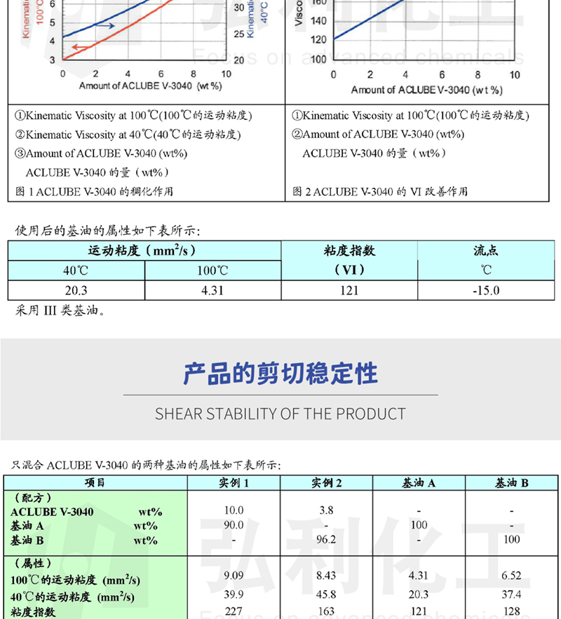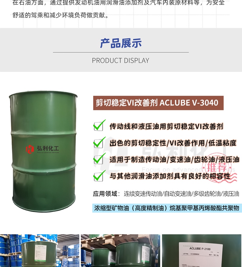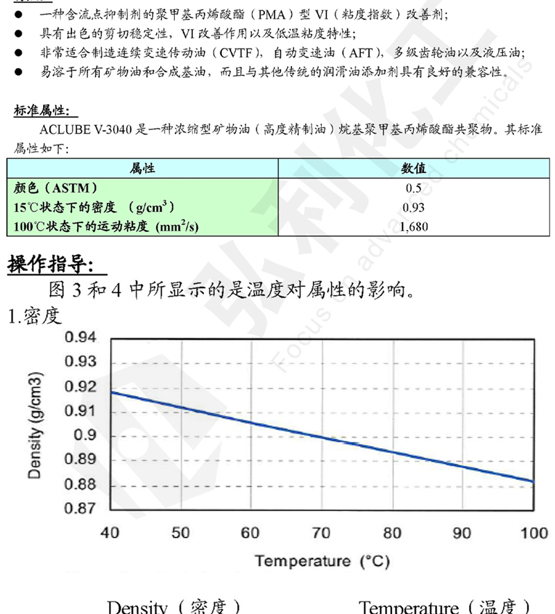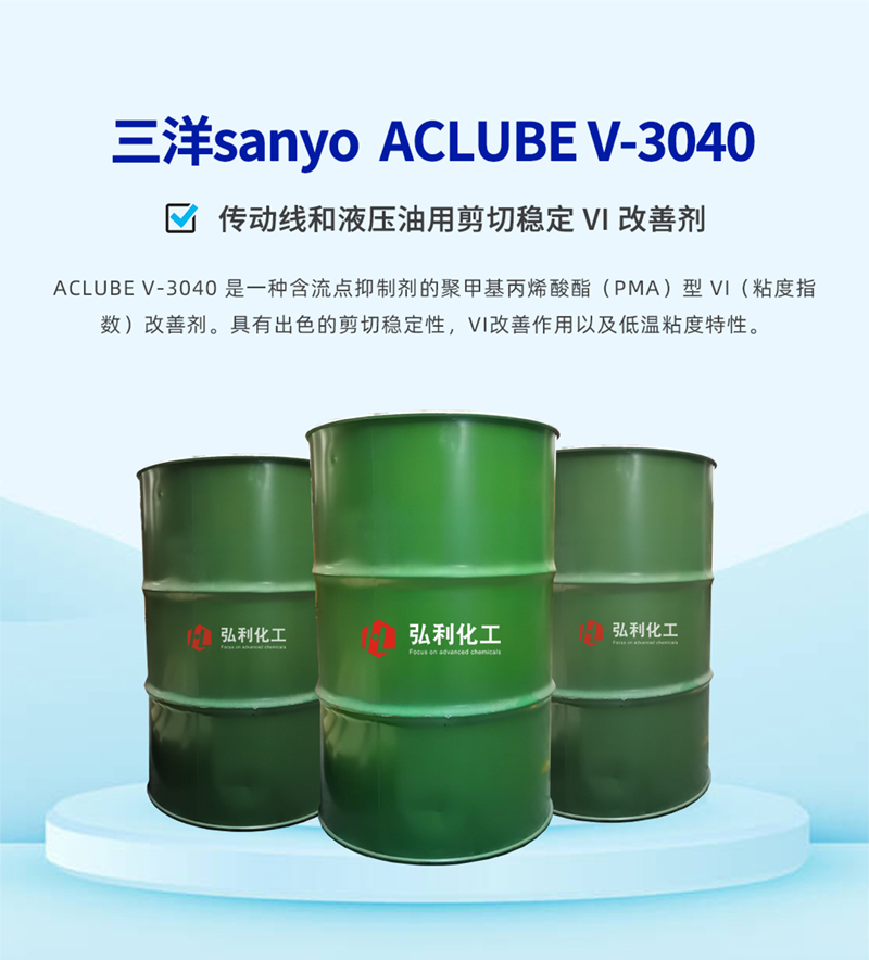 产品简介:三洋化成Sanyo ACLUBE V-3040 是一种浓缩型矿物油(高度精制油)烷基聚甲基丙烯酸酯共聚物。常用作含流点抑制剂的聚甲基丙烯酸酯(PMA)型 VI(粘度指数)改善剂。具有出色的剪切稳定性,VI改善作用以及低温粘度特性。非常适合制造连续变速传动油(CVTF),自动变速油(AFT),多级齿轮油以及液压油。易溶于所有矿物油和合成基油,而且与其他传统的bg真人平台添加剂具有良好的兼容性。